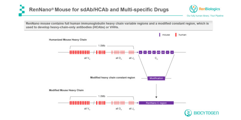 - Biocytogens RenNano®-Plattform : Verwendet eine Knock-in-Technologie mit großen Fragmenten, um Mausgene durch über 120 menschliche V-Gene in situ zu ersetzen, was zu einem vollständigen und funktionsfähigen genomischen Repertoire der variablen Region der menschlichen schweren Kette führt.