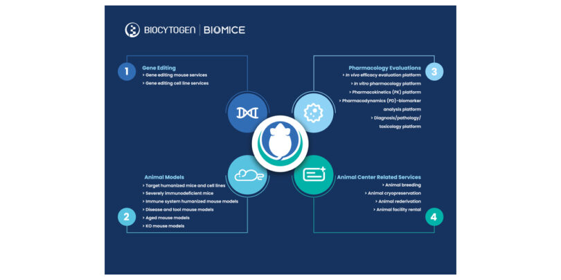 Die präklinischen Plattformen von Biocytogen bieten kundenspezifische Gen-Editing-Dienste, die Entwicklung von Standardprodukten für humanisierte und/oder immundefiziente Tier- und Zellmodelle sowie präklinische Pharmakologiedienste. Diese innovativen Produkte und Dienstleistungen ermöglichen eine effiziente Evaluierung neuartiger Anti-Human-Therapeutika, insbesondere von Biologika. Um diese Geschäftsbereiche stärker herauszustellen und das Markenimage der präklinischen Modelle und Dienstleistungen des Unternehmens zu verbessern, wird das Unternehmen diese wichtigen Plattformen unter der Submarke „BioMice™“ zusammenfassen. Als einer der Marktführer im Bereich der Herstellung von humanisierten Tiermodellen wird die Etablierung der Submarke BioMice für die präklinische Modell- und Dienstleistungssparte von Biocytogen weltweit das Bewusstsein für die zentrale Rolle der Tiermodellprodukte des Unternehmens bei der Erforschung biologischer Wirkstoffe stärken.
