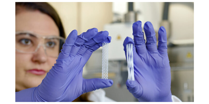Während sich die PrintRoll-Vorrichtung dreht, bewegt sich der Druckkopf hin und her und trägt Material in der gewünschten Struktur auf die Oberfläche auf. Beispielsweise härtet Polycaprolacton (PCL), ein biologisch abbaubarer Kunststoff medizinischer Qualität, der in vielen von der FDA zugelassenen Implantaten und Geräten verwendet wird, nach dem Drucken des geschmolzenen Materials schnell auf der Walze aus. Beim Bioprinting stellen Benutzer in der Regel eine Struktur oder ein Gerüst aus einem steifen oder flexiblen biokompatiblen Material her, das für die Reparatur und Integration mit Körperzellen konzipiert ist und in manchen Fällen nach einer gewissen Zeit abgebaut wird.