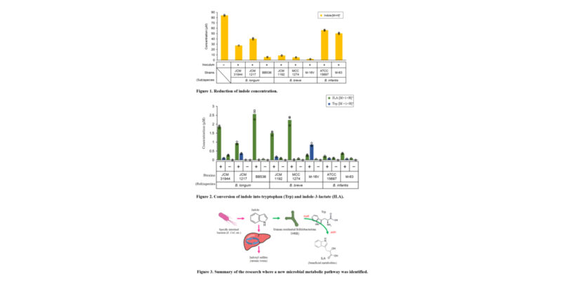 - Umwandlung von Indol in Tryptophan (Trp) und Indol-3-Lactat (ILA): Die Forschung hat gezeigt, dass ausgewählte Bifidobakterienstämme, darunter die HRB-Stämme von Morinaga Milk, Indol in Tryptophan (Trp) und Indol-3-Laktat (ILA) umwandeln können (Abbildung 2). Während Tryptophan eine notwendige Aminosäure ist, wurde ILA als eine immunmodulatorische Verbindung identifiziert, die die Gesundheit des Darms und des Immunsystems unterstützt. Diese Entdeckung ist ein bedeutender Schritt zum Verständnis, wie nützliche Darmbakterien schädliche Substanzen in gesundheitsfördernde Verbindungen umwandeln können.